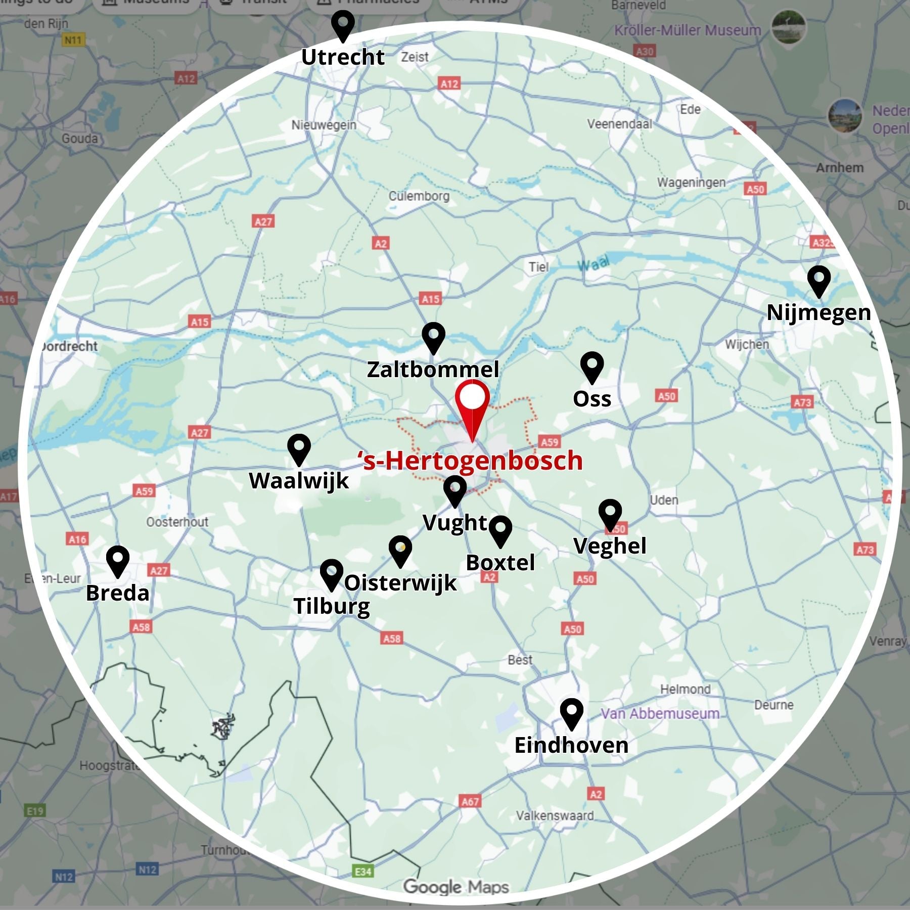 Wij zijn actief in 's-Hertogenbosch en binnen een straal van 50 km: Eindhoven, Tilburg, Breda, Nijmegen, Utrecht, Waalwijk, Oss, Veghel, Vught, Zaltbommel, Boxtel, Oisterwijk.